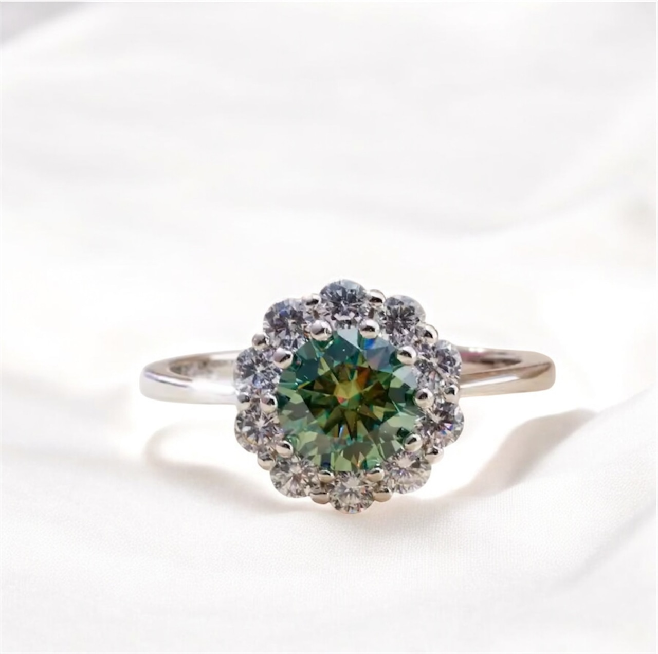 センターに、希少な淡いブルーのモアッサナイトをセットしたヘイローデザインのリングです。