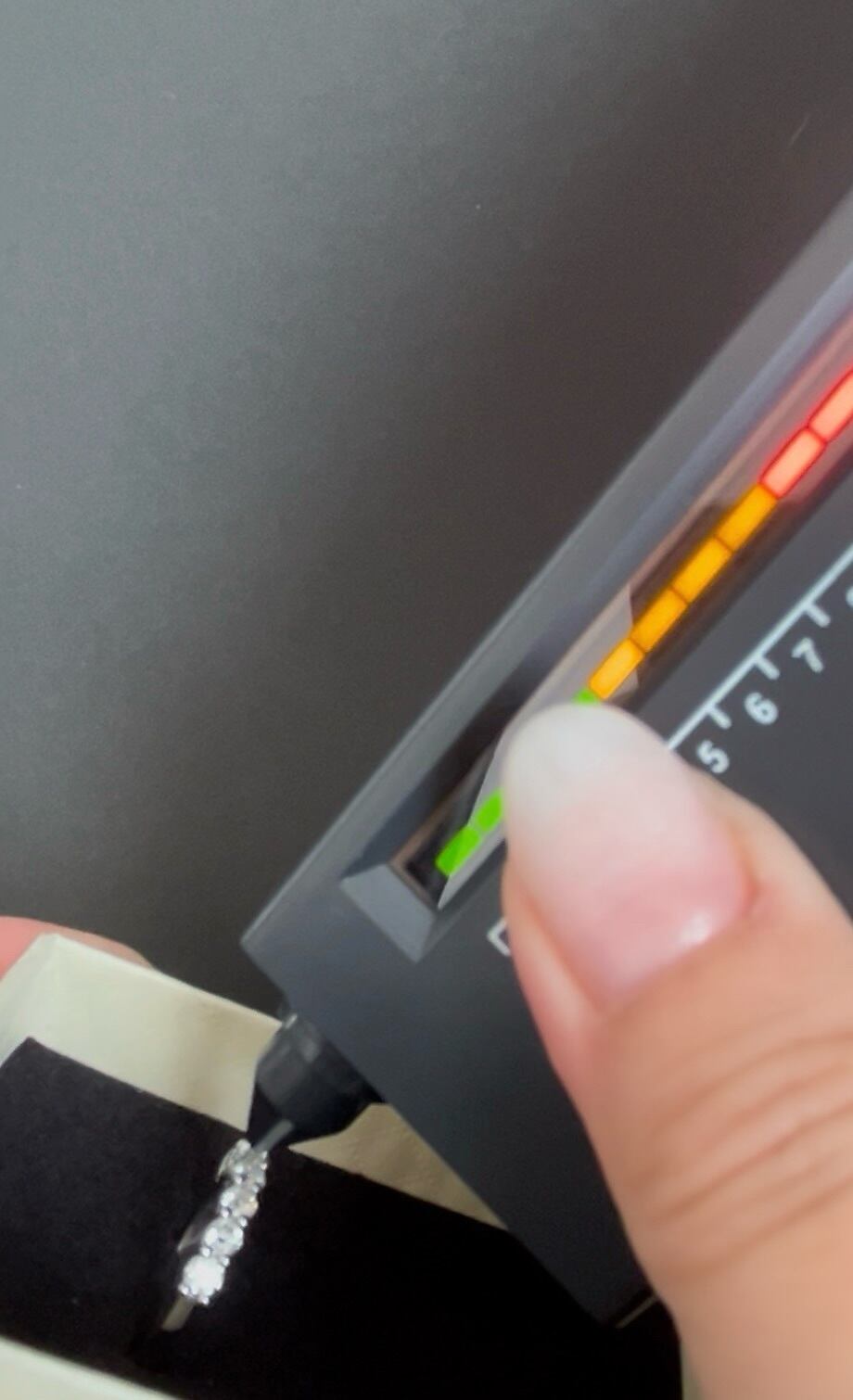 使用しているのは、無色透明の「Dカラー」、そして内包物が極めて少ない「VVS1」クラスのストーンのみ。3mmのストーンを7石連ねた贅沢な作りで、光を受けるたびに指先でまばゆい輝きを放ちます。